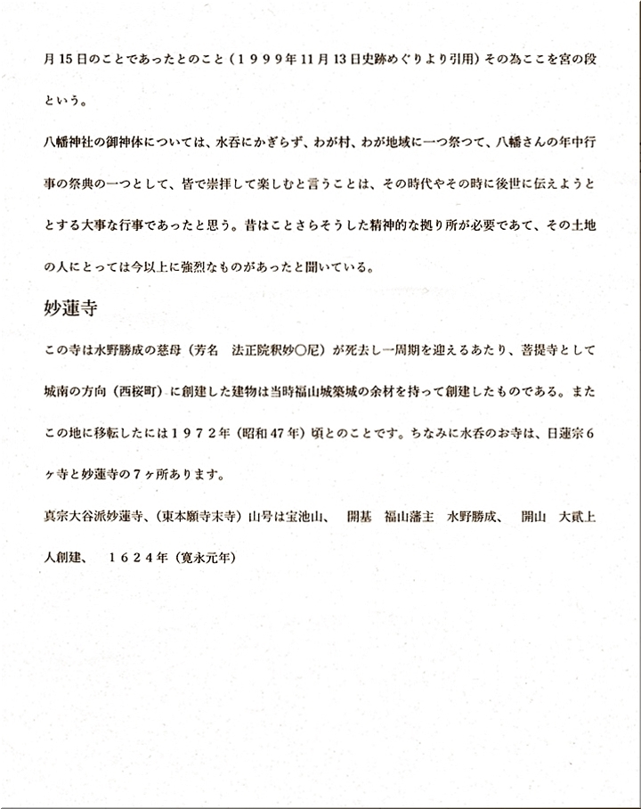 八幡神社のご神体については、水呑に限らず、我が村、我が地域に一つ祭って、八幡さんの年中行事の祭典の一つとして、皆で崇拝して楽しむと言うことは、その時代やその時に後世に伝えようとする大事な行事であったと思う。昔はことさらそうした精神的な拠り所が必要であって、その土地の人にとっては今以上に強烈なものがあったと聞いている。