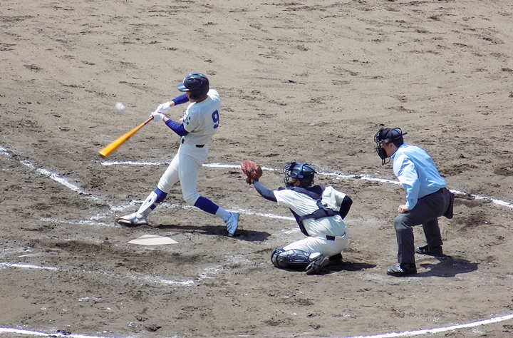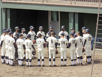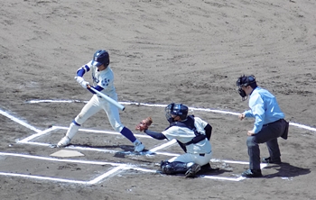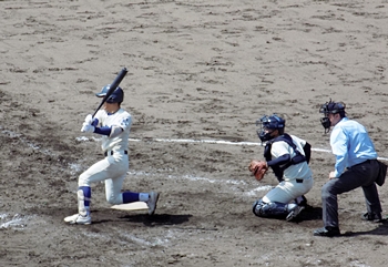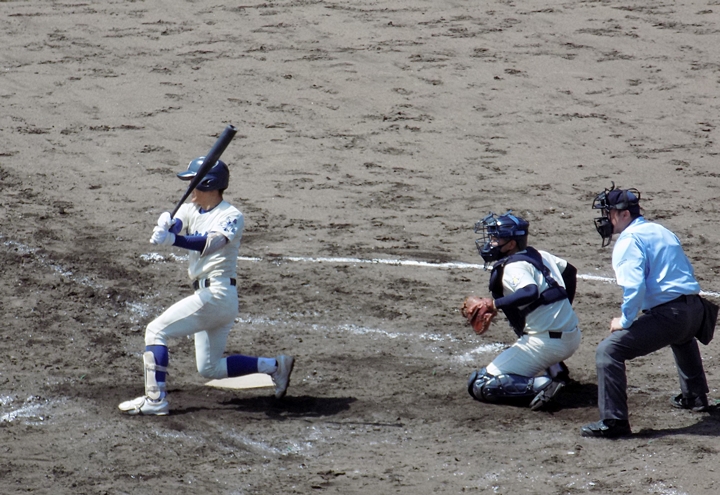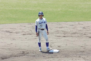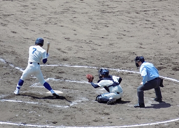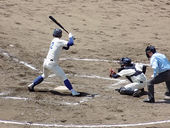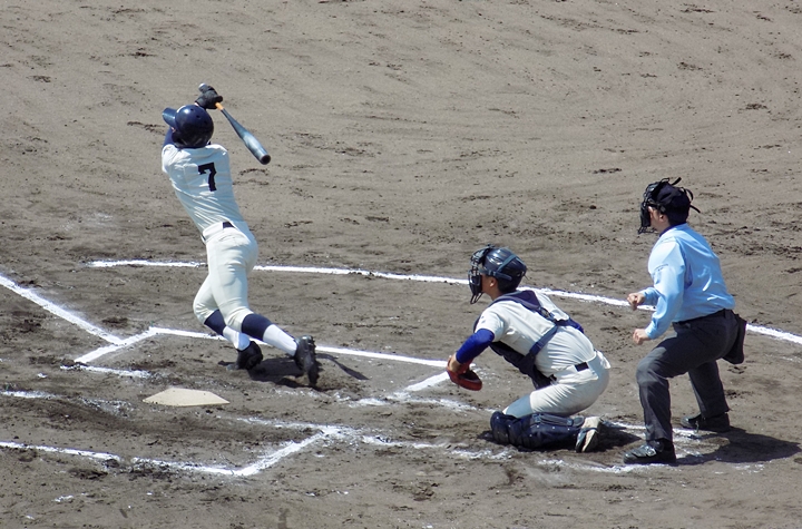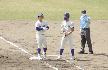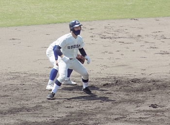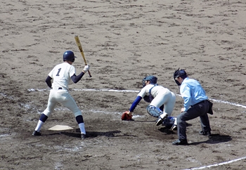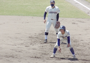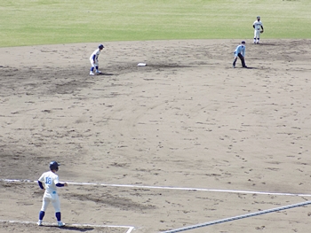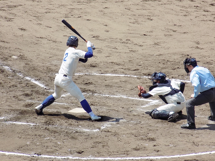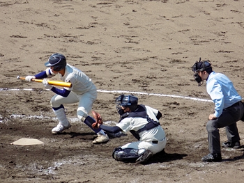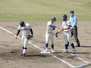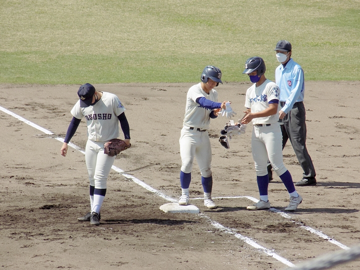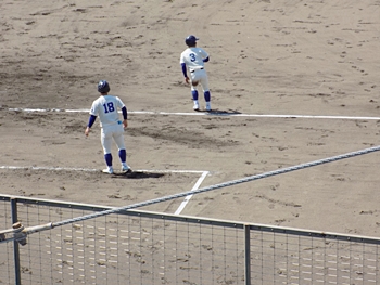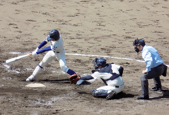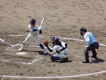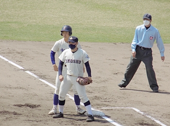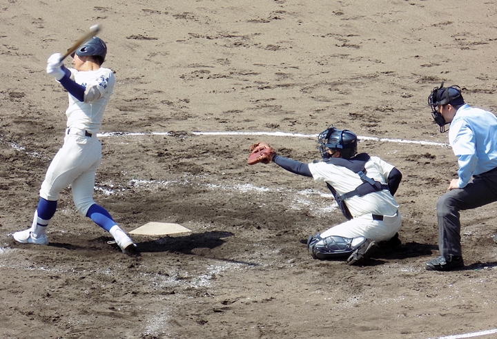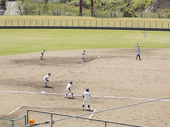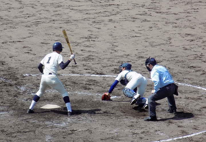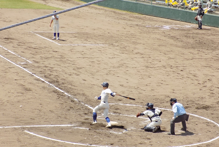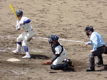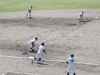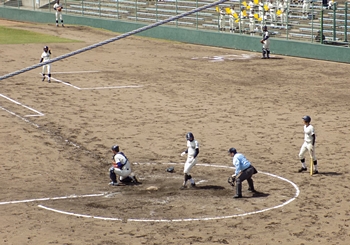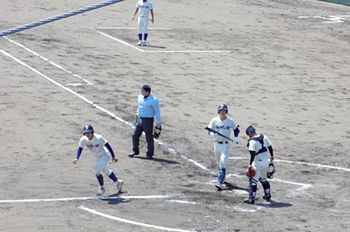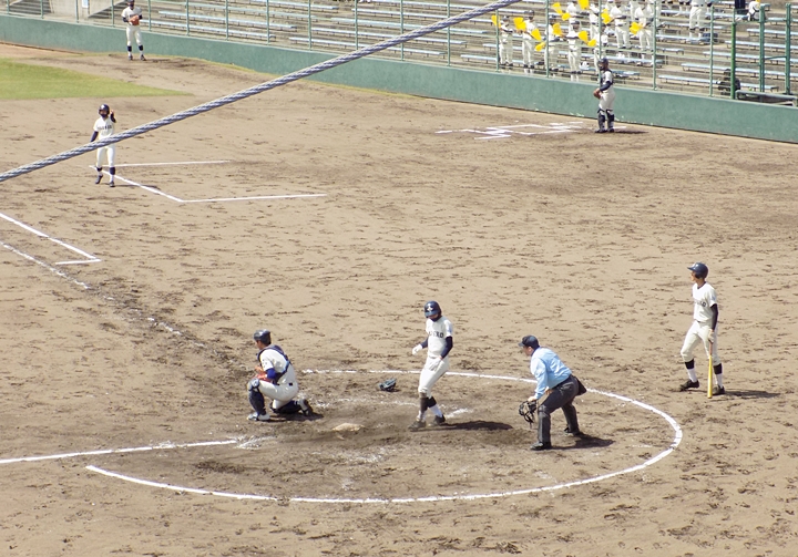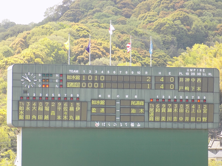 「如水館2×0尾道商」で迎えた4回裏の尾道商の攻撃です。数少ないチャンスを得点に繋げ「如水館2×1尾道商」と反撃で、締まった展開が続きます。