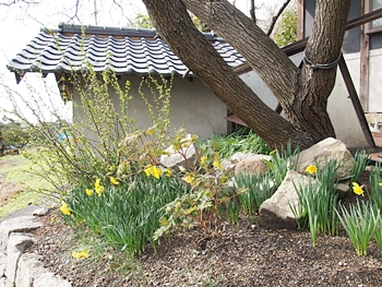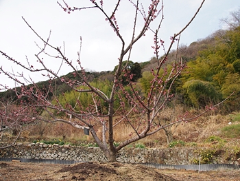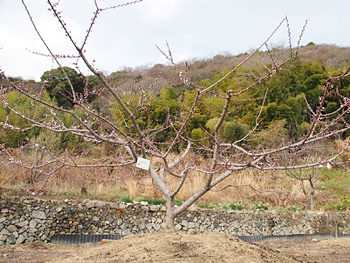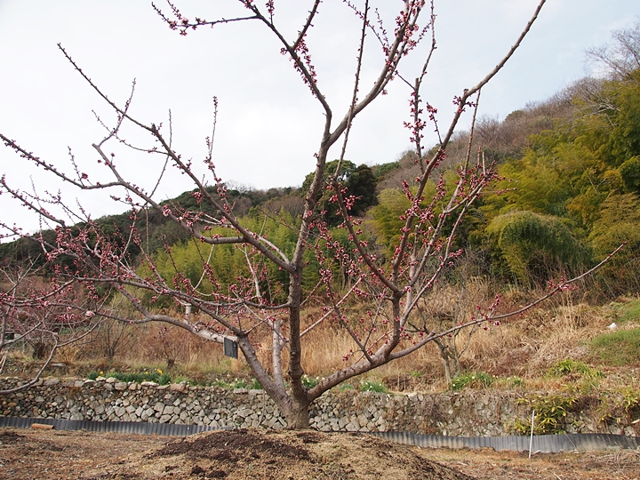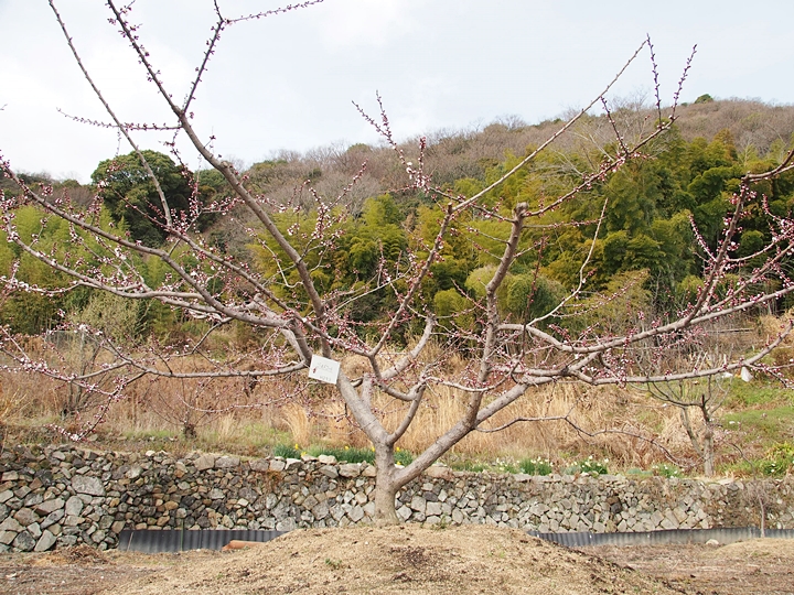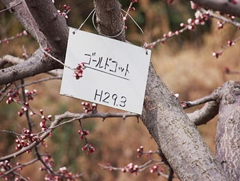 円明寺近くの杏畑も、まだ蕾状態です。品種は「ゴールドコット」の表示が…でも、ゴールドコットは、どんな杏なんでしょうねぇ〜