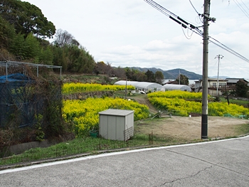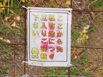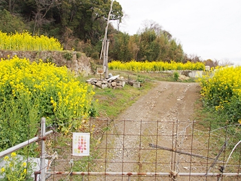 菜の花畑と、十三仏に上ります市道を挟んで対面側の畑には、「はねつるべ」が存在します。この「はねつるべ」を画像に納めようと向かいましたけど、『ここからは私有地につき立入りご容赦下さい』との注意書きが…