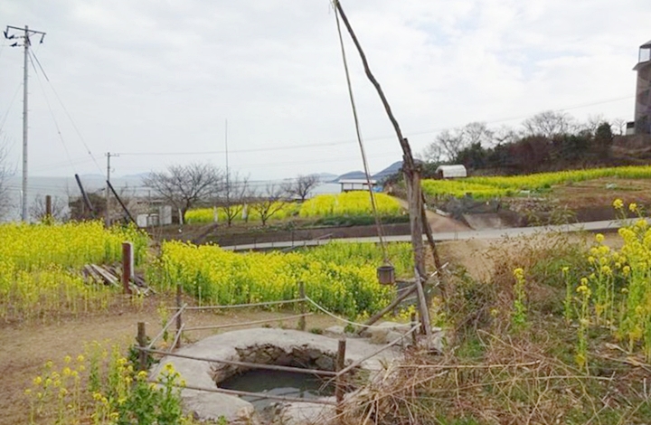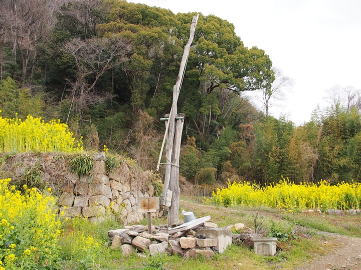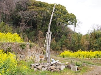 『ザ!鉄腕!DASH!』のロケが行われた田尻町。この写真は、その際にTOKIOの方々が作り方を教えてもらった「はねつるべ」という井戸です。菜の花畑の中に2つほど残っています。