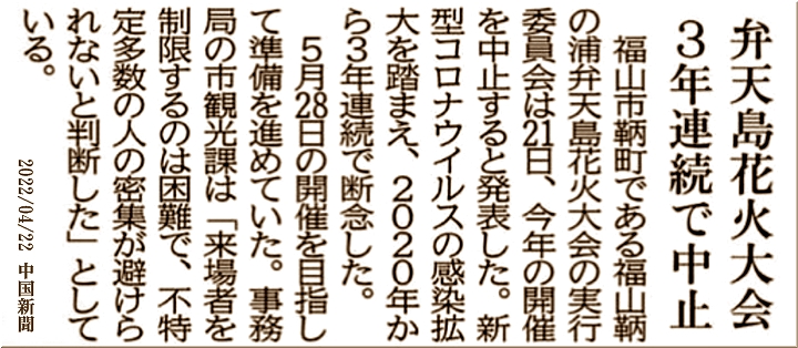 今朝の中国新聞朝刊には、5/28(土)に開催予定でありました「鞆の浦弁天島花火大会」中止の記事掲載が…う〜ん、これで、3年連続で中止となりますねぇ〜