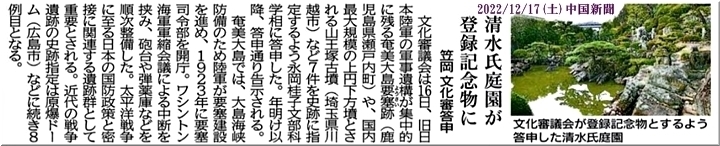 10日ばかり前の中国新聞朝刊に、清水氏庭園≠ェ登録記念物≠ノ新登録が決まった旨の記事掲載がありました。