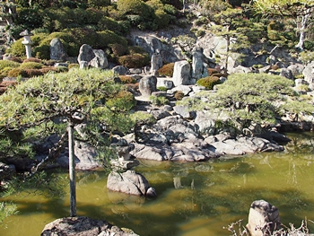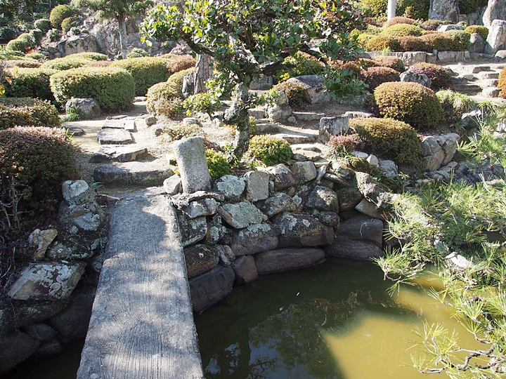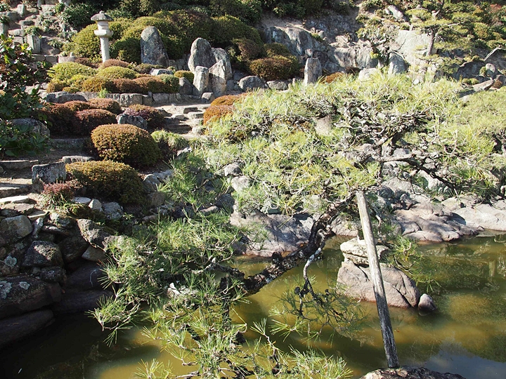 岡山県文化財課によりますとこの庭園は、江戸時代に笠岡市で廻船問屋を営んでいた清水家の別邸に造られました。岩礁が広がっていた場所に造られていて、園内の池は当時の波打ち際をそのまま利用しています。