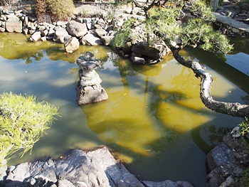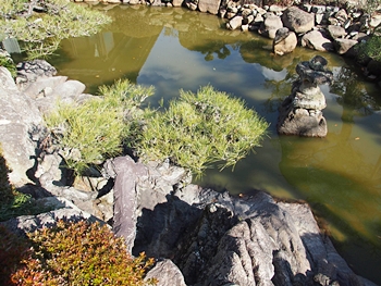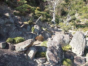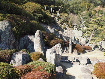清水家庭園は、もともと生江浜の海岸線であった場所に造られているため、自然の露岩や山肌を活かした作りとなっています。また、池を巡りながら鑑賞する「地泉回遊式庭園」です。南方に見える「宮山」を借景としています。
