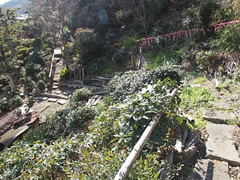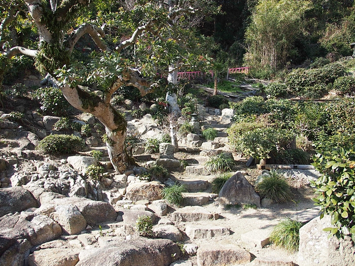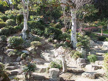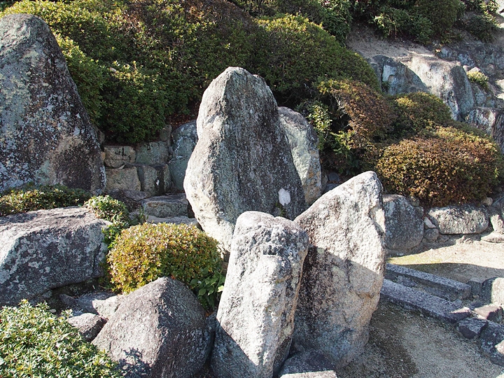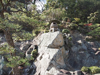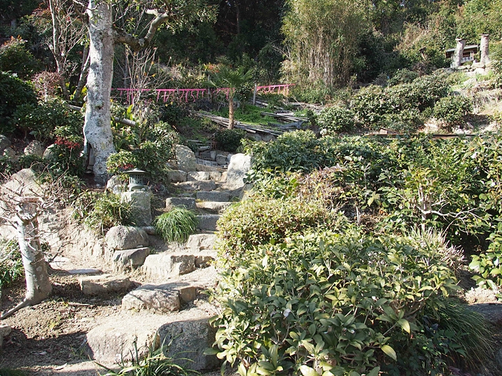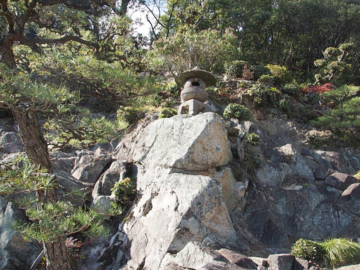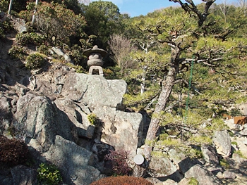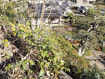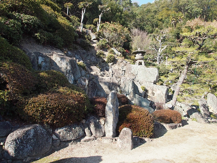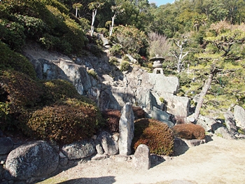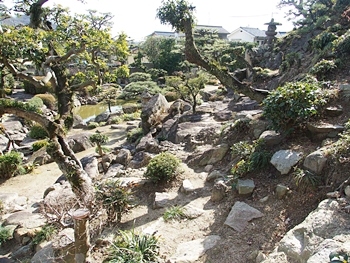 また、敷地内には、小さな庵のような建物の痕跡が残っています。特に主屋背後の小高い場所にあった「望海亭」跡地は眺望のよい所で、かっては西浜(ようすな)の海岸や笠岡湾までが一望できました。