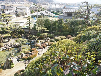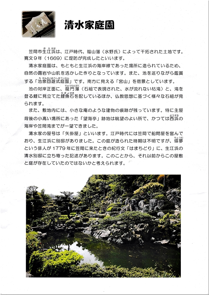 清水家の屋号は「矢掛屋」といいます。江戸時代には笠岡で船問屋を営んでおり、生江浜に別邸がありました。この庭が造られた時期は不明ですが、蝶夢という俳人が1779年に笠岡に来たときの紀行文「はまちどり」に、生江浜の清水別邸に立ち寄った記述があります。このことから、それ以前からこの屋敷と庭が存在していたのではないかと考えられます。