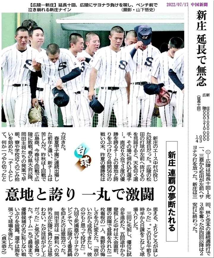 2回戦へと勝ち進みました新庄高、2回戦では、7/16(土)の対広陵戦で「広陵4×3新庄」と、延長戦にもつれ込みましたけど惜敗となりましたようですネ。