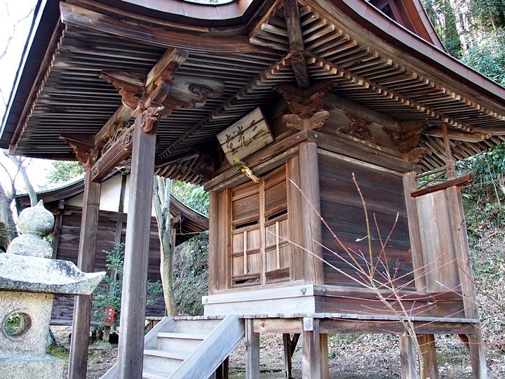 本殿の建築様式は一間社流造で小社ではあるが屋根には千鳥破風が付く。向拝は軒唐破風で?葺(こけらぶき)屋根だ。覆屋に収められているために保存状態は大変良い。恐らく創建から一度も雨風にさらされたことがないのではないかと思う。祭壇までは開いてみなかったが、開けると三十体の本地仏が鎮座しているのであろうか。