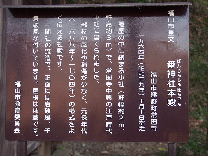 この後の渡辺氏であるが、慶長5年(1600)、関ヶ原合戦で毛利氏と共に戦い敗れた。最後の城主渡辺景は、一乗山を退去し渡辺氏の歴史は幕を閉じた。しかし、景の5人の息子達は、約20年間に及ぶ浪人生活の後、元和5年(1619)、福山にやってきた水野勝成の家老上田玄蕃により福山藩に召し抱えられ、3男の日保は常国寺住職としてその菩提寺を守ることが出来たのだ。渡辺氏の名前は一文字が多い。その常国寺境内に番神社は覆屋に守られて鎮座している。明治の廃棄処分を免れた本殿は、日保の跡を継いだ日感が開山堂、番神堂(番神社)、喜正堂、三光堂、大鼓堂、鐘楼を建立し本堂客殿を再建している。元禄年間に再建された番神社本殿、唐門、鐘楼は福山市の重要文化財に指定されている。