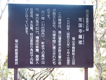 この鐘楼は、福山藩家老水野玄蕃の母が施主となり、元禄年間に建立されたものです。
