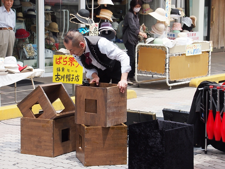その間には、何故か「Monsieur みの吉」sanも。この『足長君(あしながくん)』もバラ祭りではお馴染みですけど、この方のメインのパフォーマンスは、何なんでしょうネ。何でもされそうですけど、ジャグリングなのかも(^-^)//"