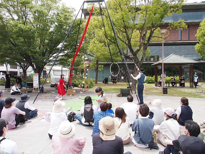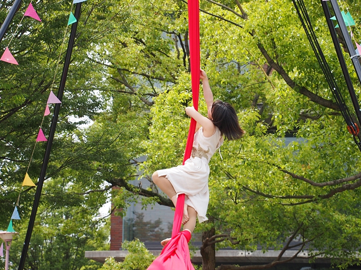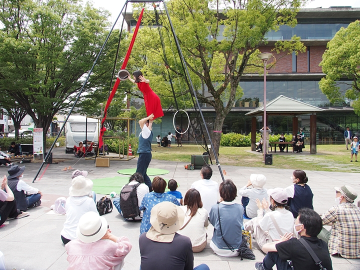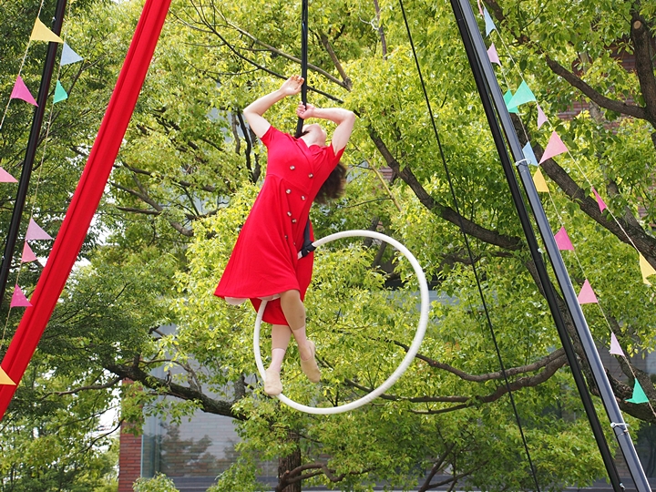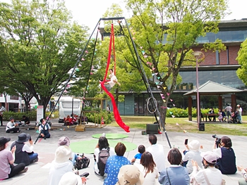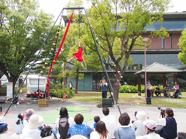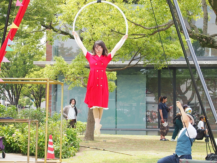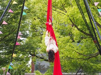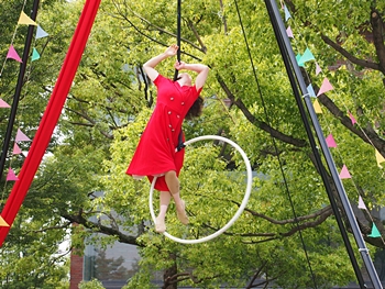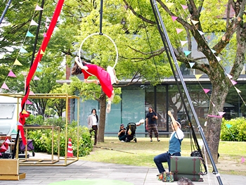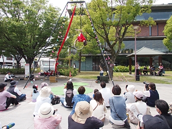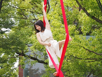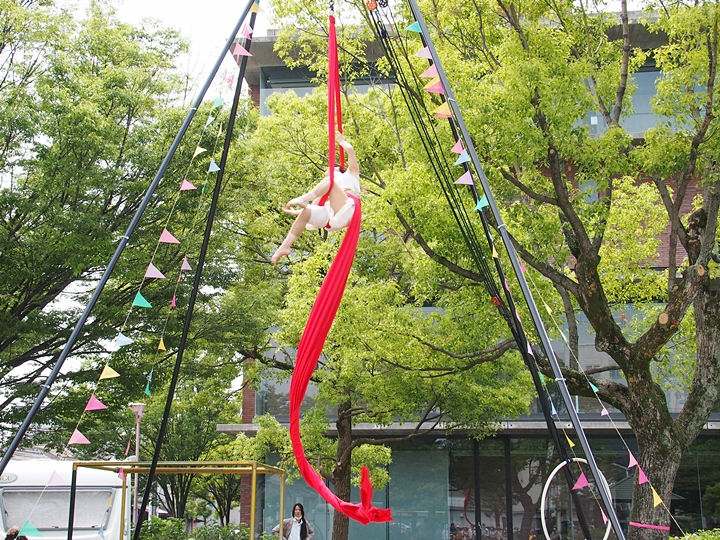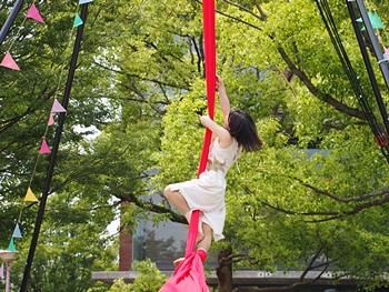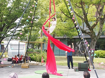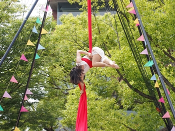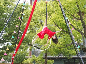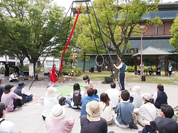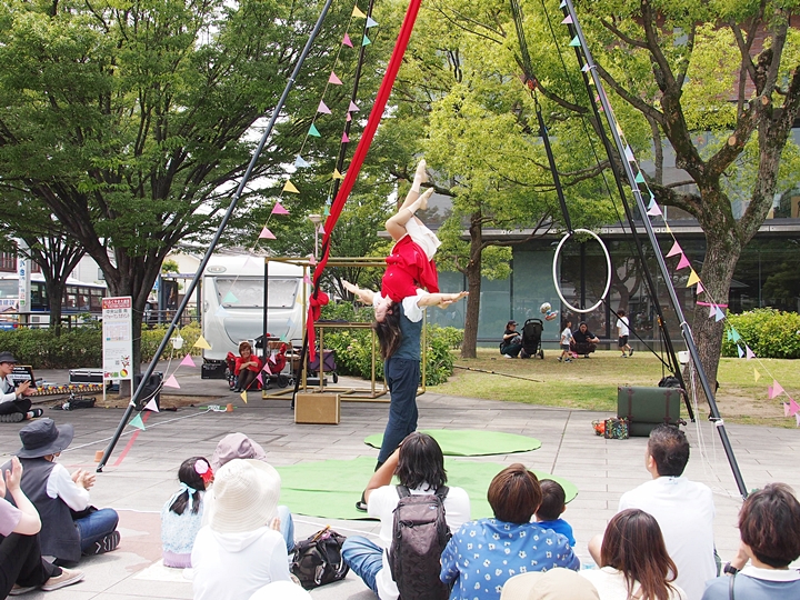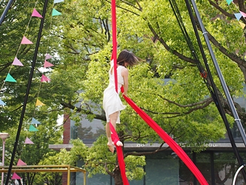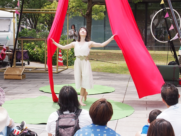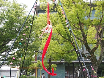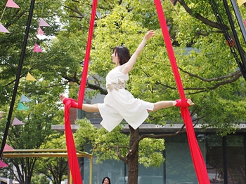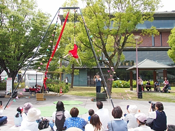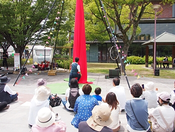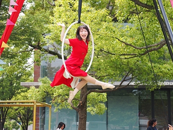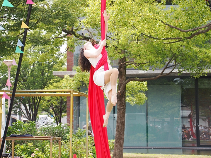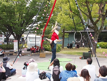なら、バラ公園に行ってみよう…と、中央公園南側入口方向に向かいますと、ここでは、「空中で演技するエアリアルパフォーマーの長すみ絵さん」と「国内外で活躍するジャグラーの森田智博さん」のお二人のパフォーマンスが(^.-)☆