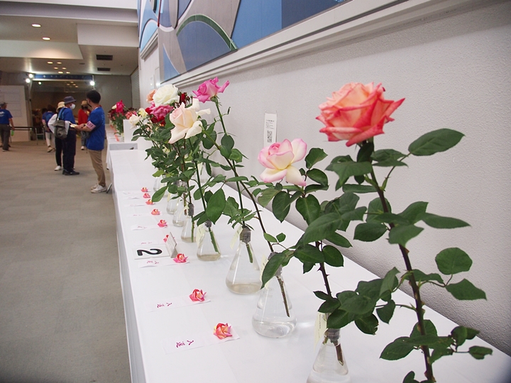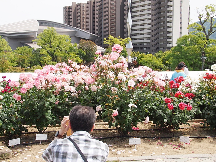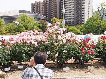 本数も多いし、色んな種類のバラが並んでいますから、皆さん、思い思いの場所でカメラを向けておられます。そんな様子を後方から拝見しながら、何枚か、カメラを向けておられます方々の後ろ姿を画像に納めますのも、また楽しいですねぇ〜