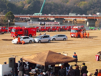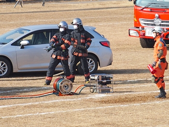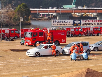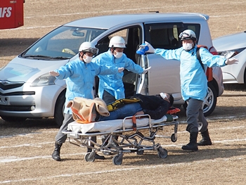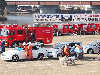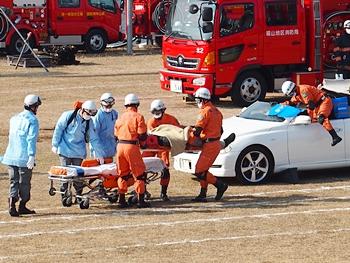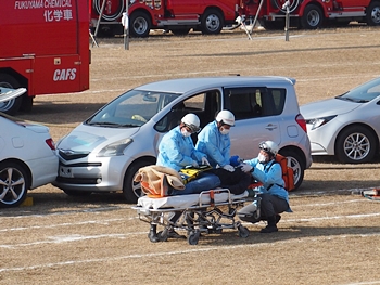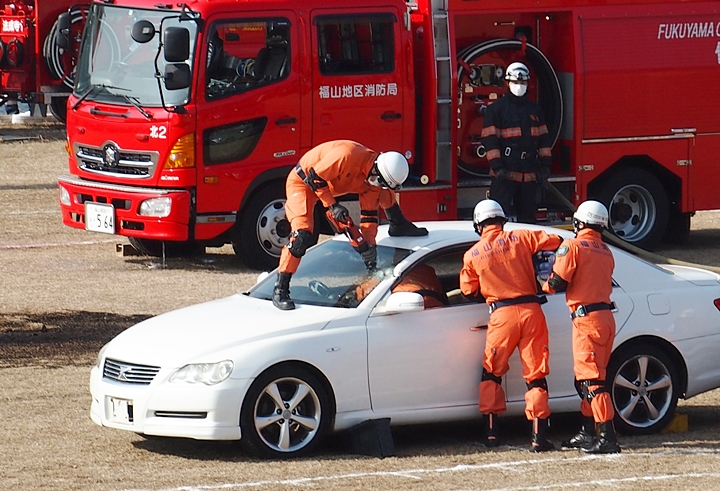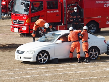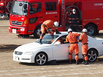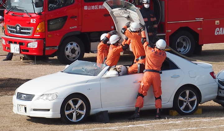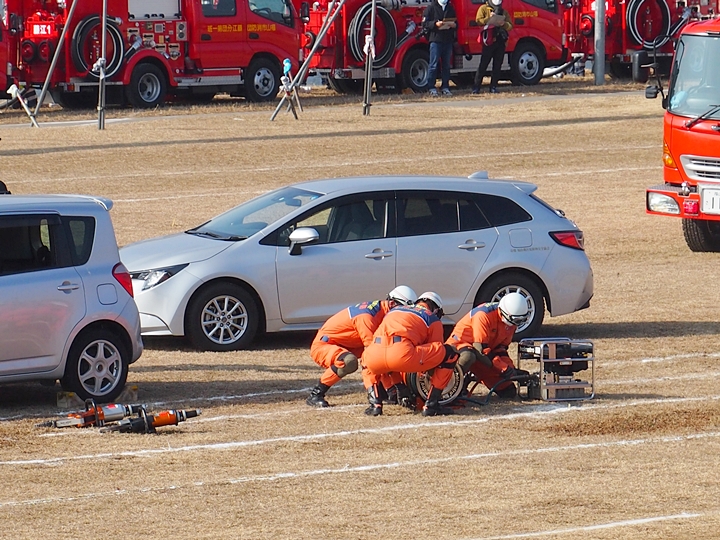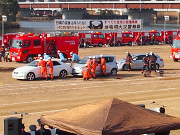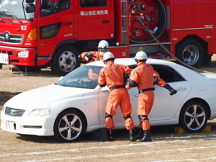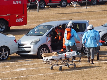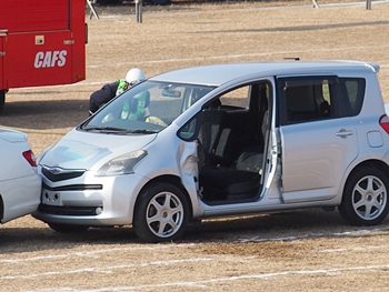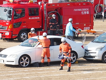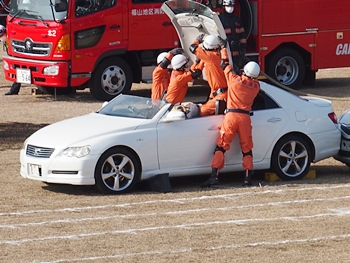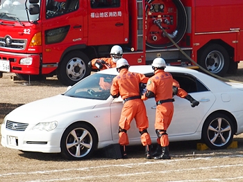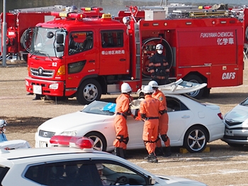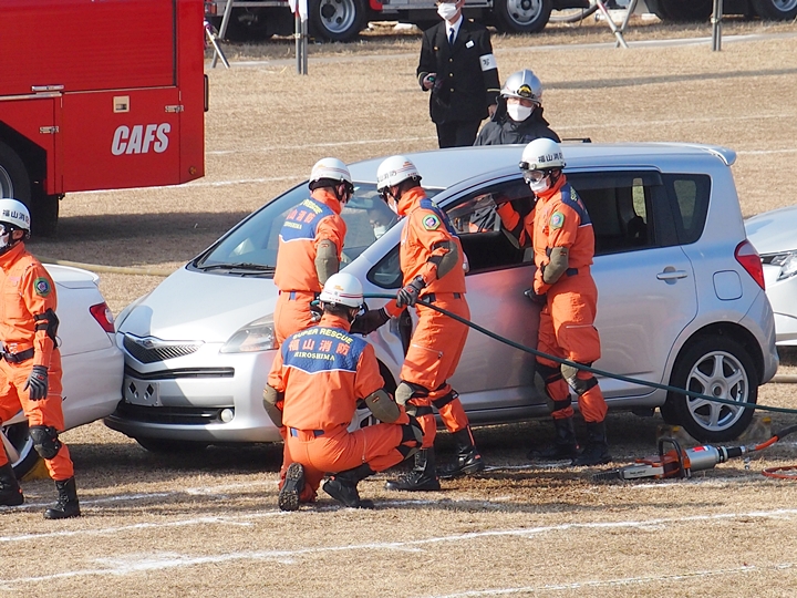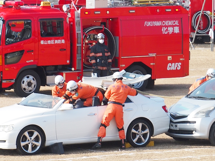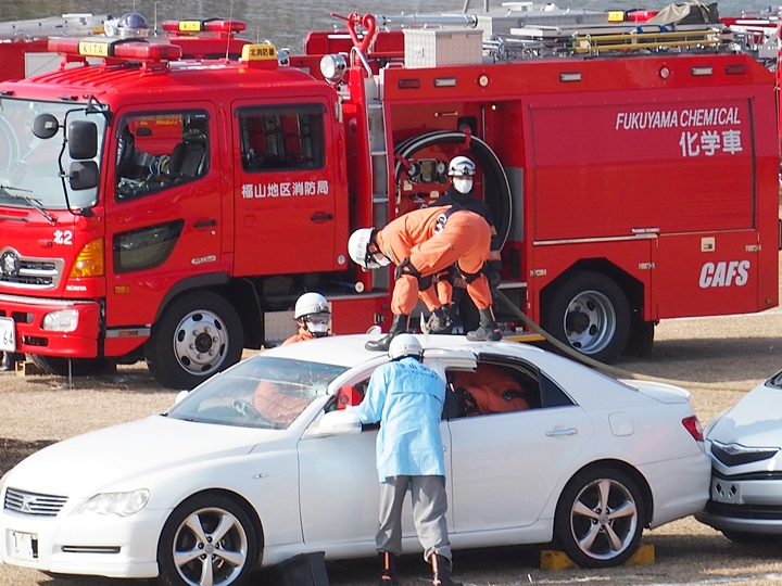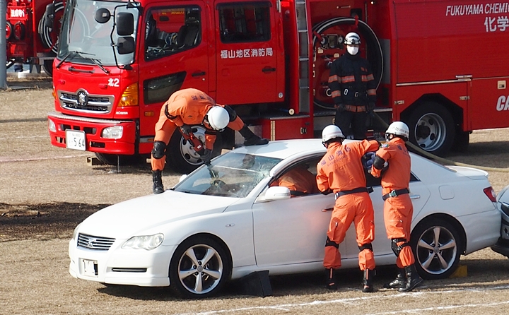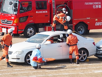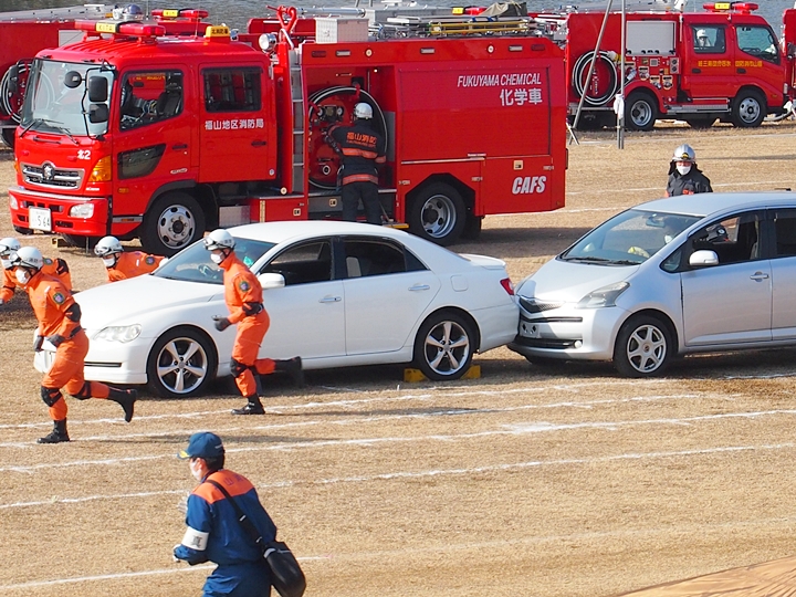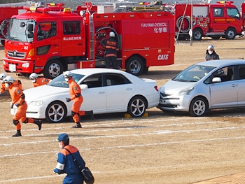 化学工場火災の鎮火後は、車輌の追突事故発生。車内に閉じ込められました人の救出で、レスキュー隊が出動です。