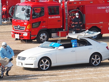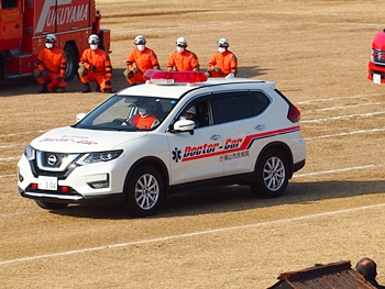 車内に閉じ込められました方の救出が進んでいましたところへ、福山市民病院のドクターカーが急行です。