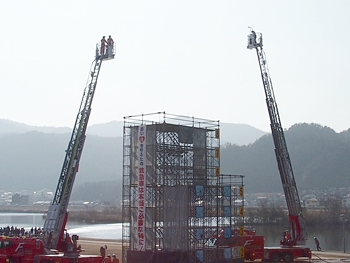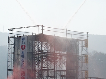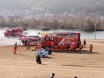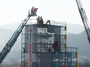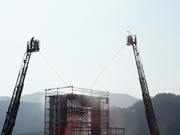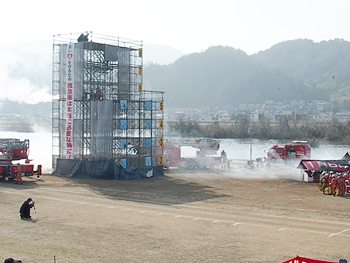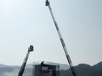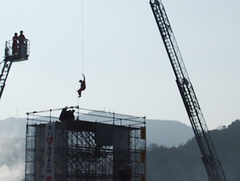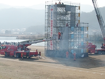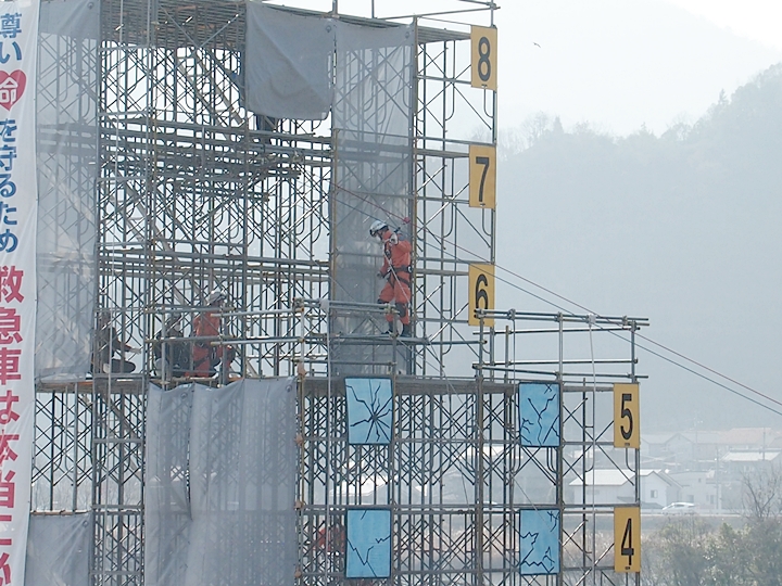 建物3階辺りとロープを繋ぎ、4名の隊員がロープを引っ張って走り、その力で、救出作業を行います隊員を3階へ。逃げ遅れた方と隊員が一緒に下へ降下と同時に、また別の隊員が3階へ。