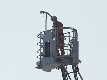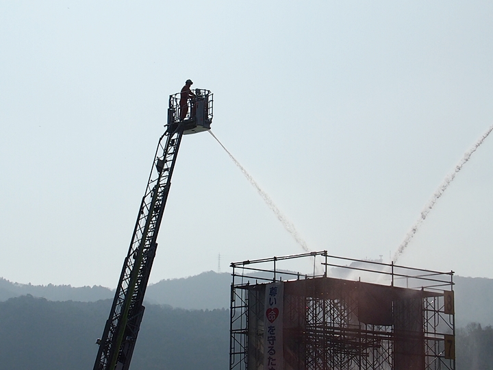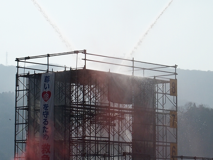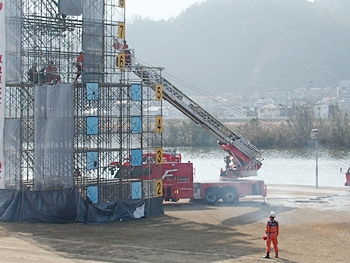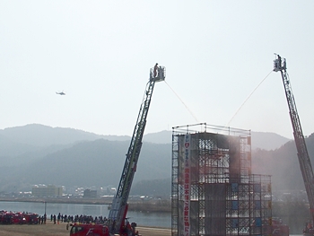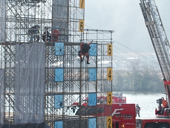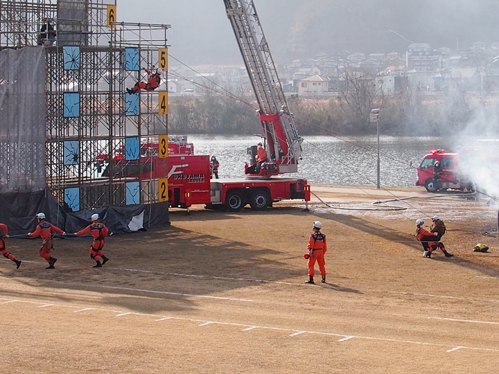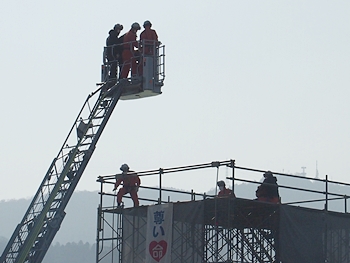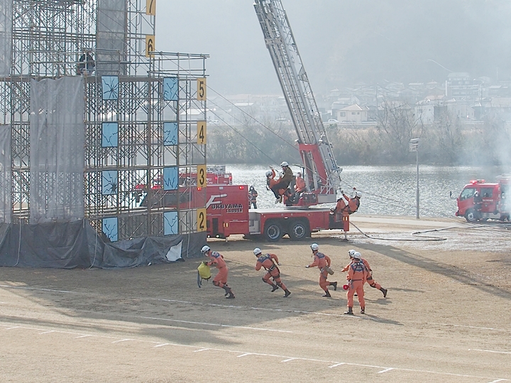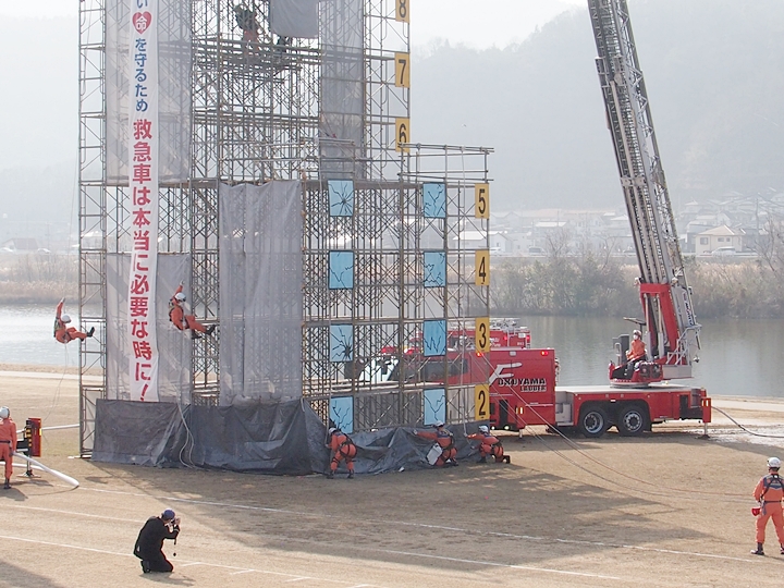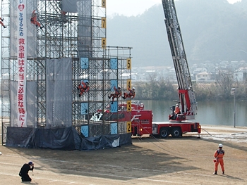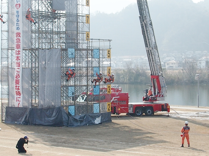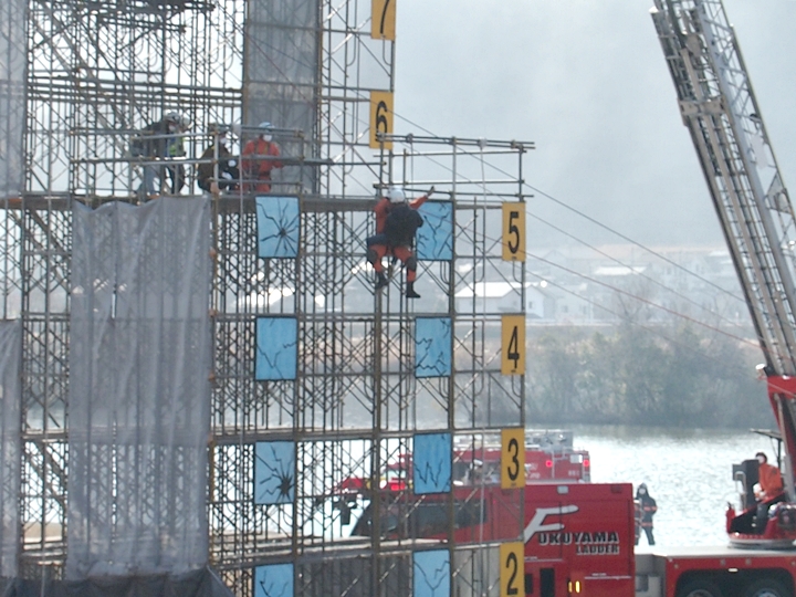 逃げ遅れました方々の救出を終えますと、レスキュー隊の皆さんが、下にロープを垂らし、このロープを使用しスルスルッと、いとも簡単に降下です。これがまた、カッコいぃんです(^_^)v