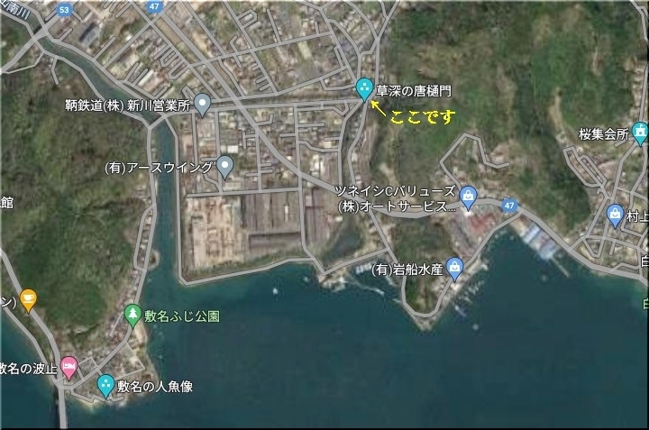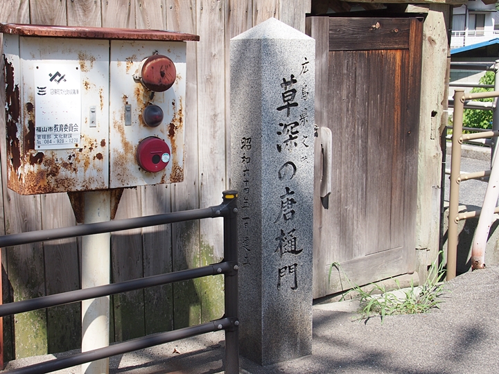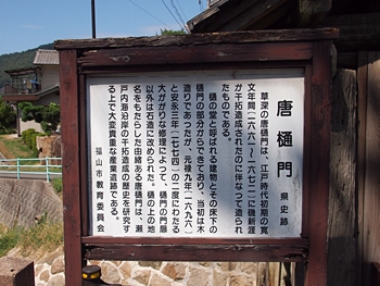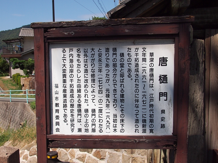 沼隈町の南西部にある草深の南端に「磯新涯」という干拓地がある。福山藩の財政施策として寛文年間(1661〜1673)の頃およそ50haの干拓が行われたもので、この際に山南川の川口を堰止め、造成された新涯地への農業用水調整のために造られたのが、草深の唐樋門である。
