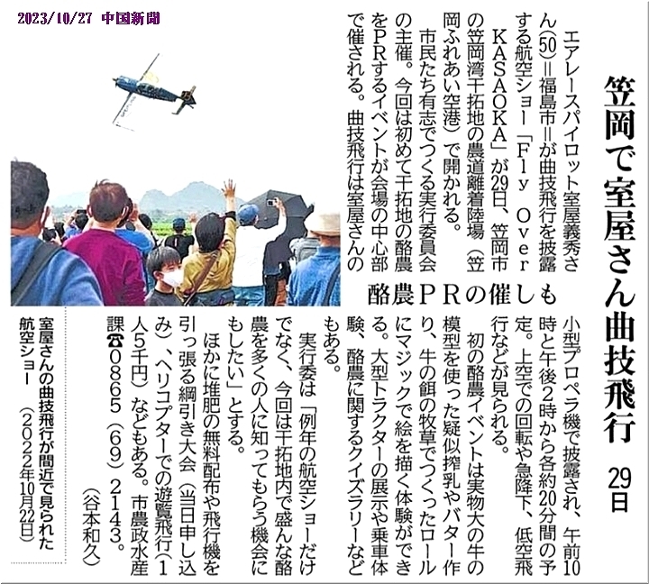 10/27付け中国新聞朝刊記事に誘われて、10/29(日)には久し振りに「航空ショーFLY OVER KASAOKA 2023=v見物で、笠岡湾干拓地の笠岡ふれあい空港″sきのGONsanでした(^.-)☆