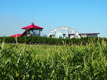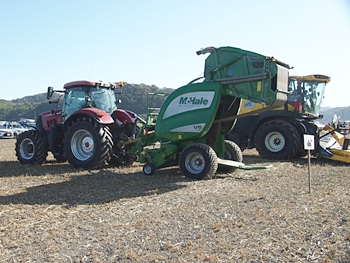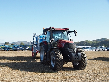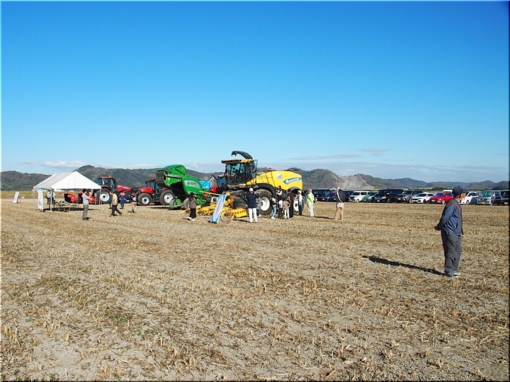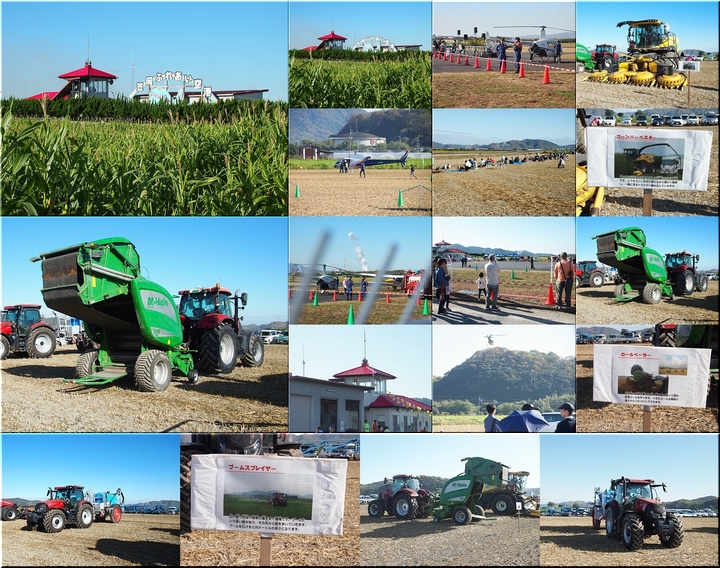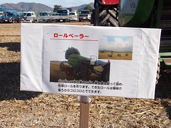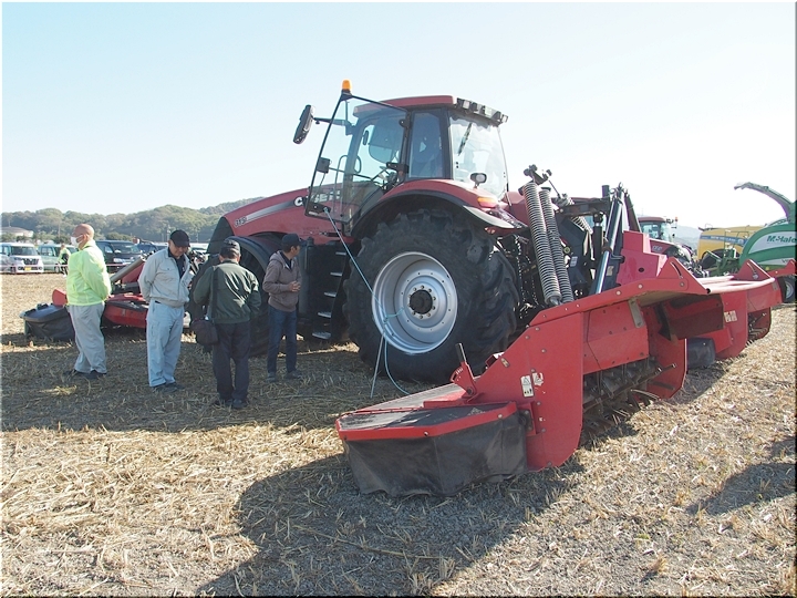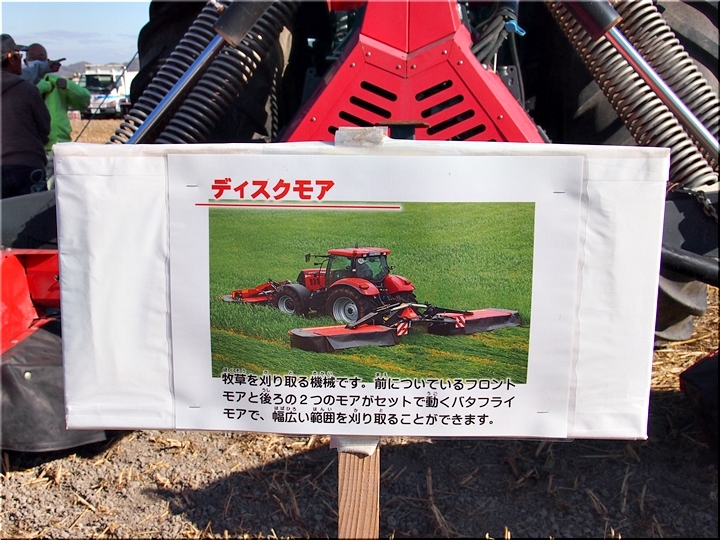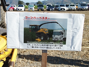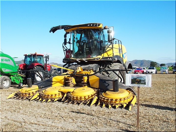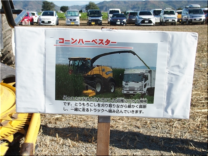 ★コーンハーベスター:牛のえさになるとうもろこしの収穫に使う機会です。トウモロコシを刈り取りながら細かく裁断し、一緒に走るトラックへ積み込んでいきます。