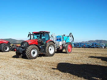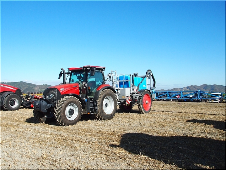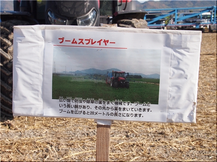 ★ブームスプレイヤー:広い畑で防虫や除草の薬をまく機械です。ブームという長い腕があり、その先から薬をまいていきます。ブームを広げると20メートルの長さになります。