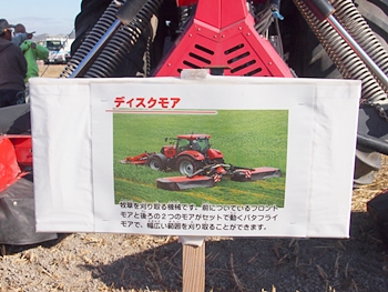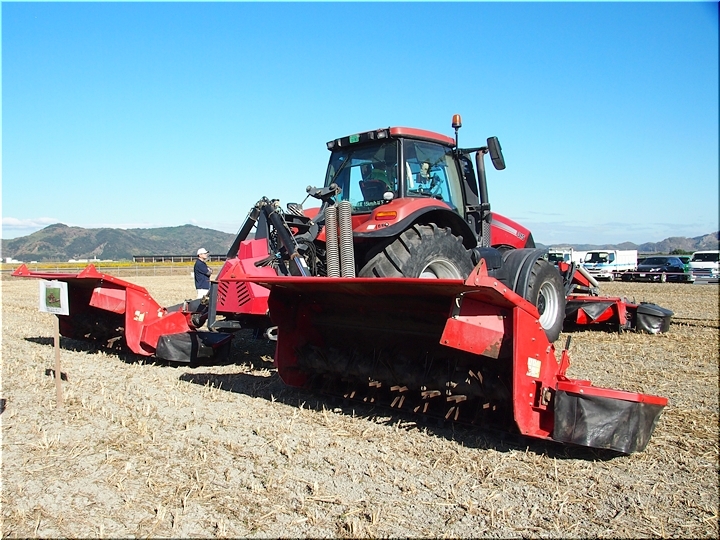 牧草を刈り取る機械です。前に付いているフロントモアと、後ろの二つのモアがセットで動くバタフライモアで、幅広い範囲を刈り取ることが出来ます。
