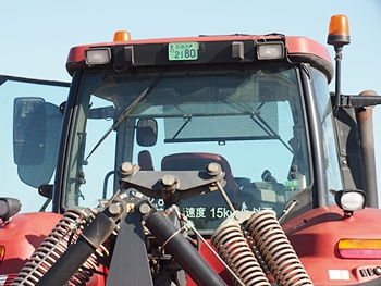 こんな農業用大型トラクターは、公道を走行します時には、最大速度15km/h以下のようであります。フロントガラス下部には、そのような記載が(^.-)☆
