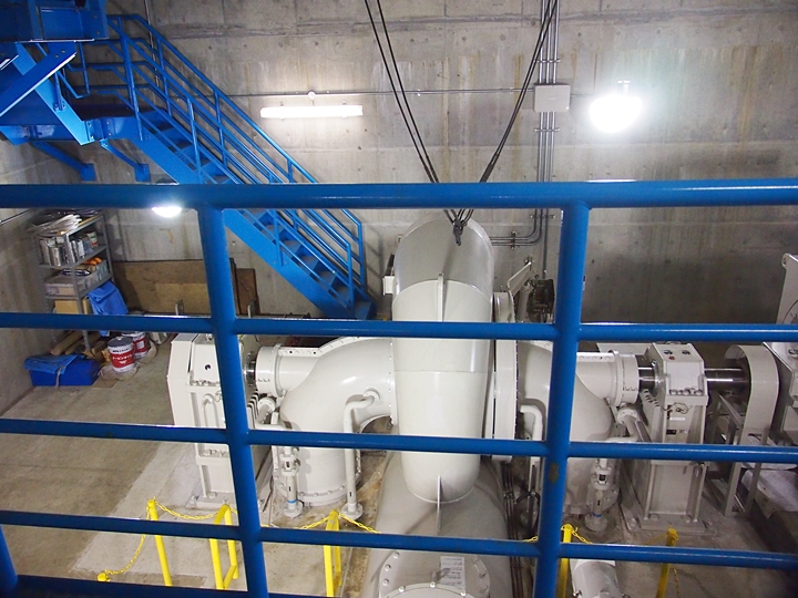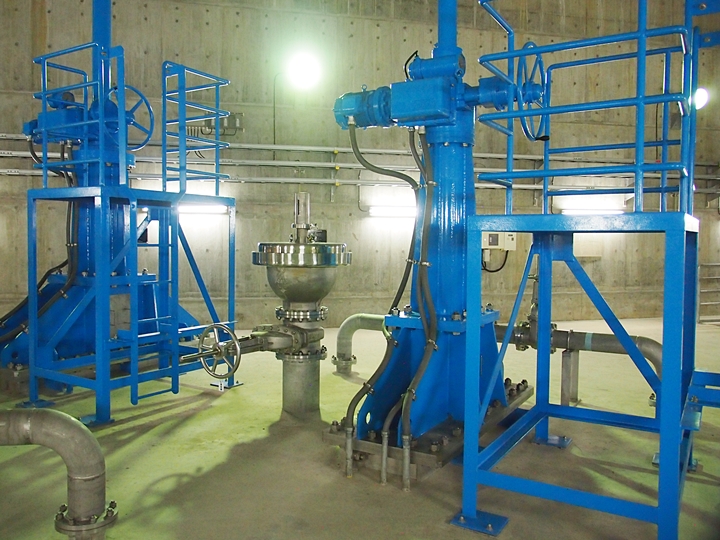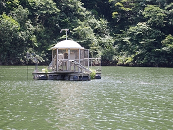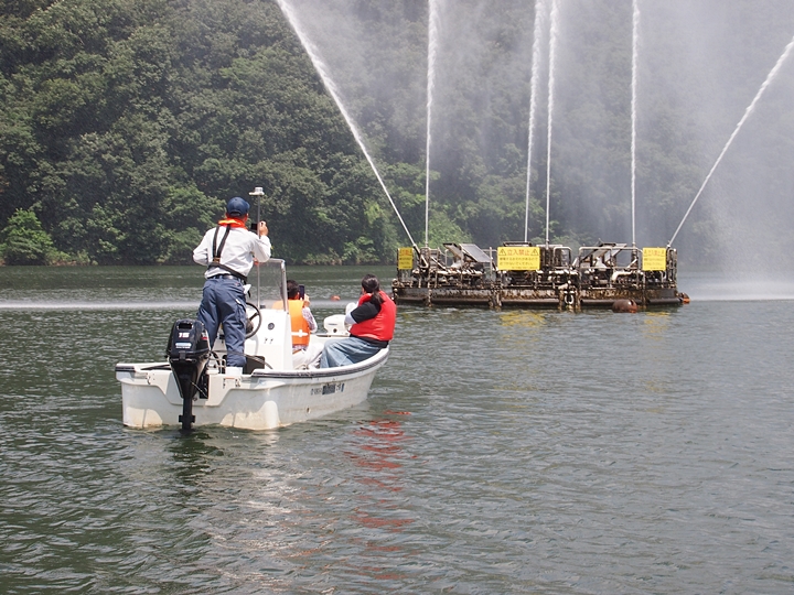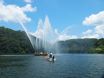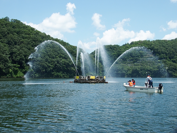 ダムの底から気泡を発生させたり、水を打ち上げたりする事で、ハイヅカ湖の水を循環させて、アオコの原因となる植物プランクトンが異常発生する事を抑えるように努力しています。