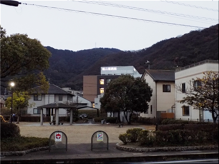 我が屋に戻って来ますと、公園越しに福山南病院をパチリ。翌日の安全パトロール時に、今一度、パチリです(^.-)☆