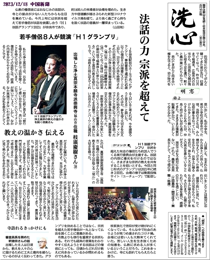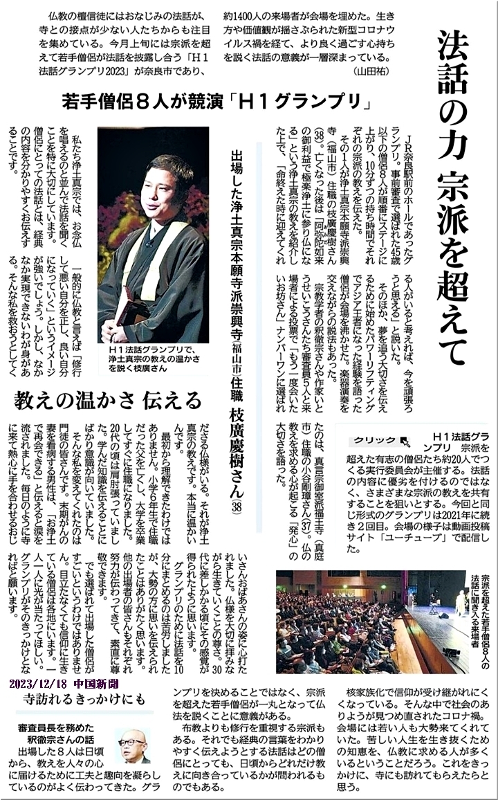 H1法話グランプリ2023≠ヘ、12/2(土)に開催されましたけど、このグランプリでステージに立ちました枝広住職の話題は、本日の中国新聞朝刊の『洗心』でも取り上げられておりました。