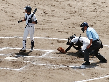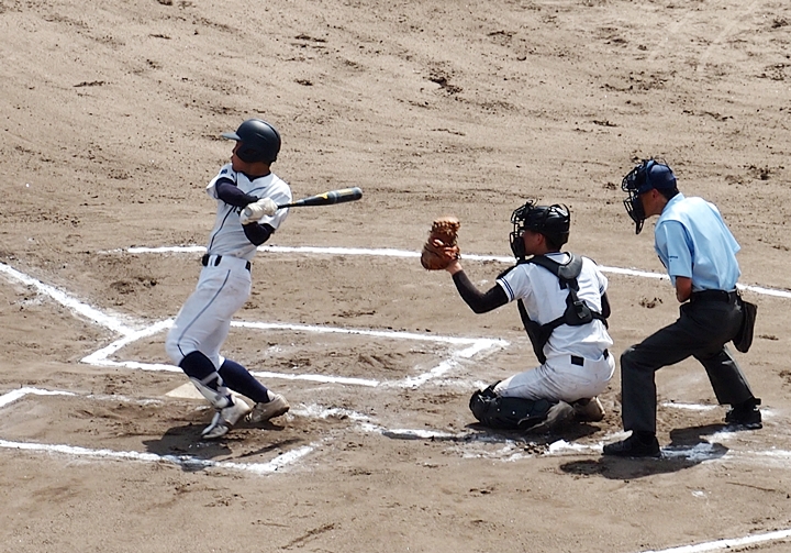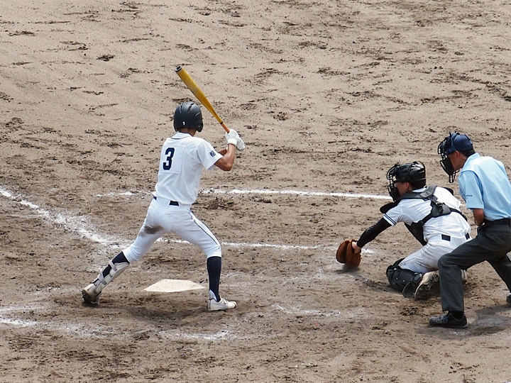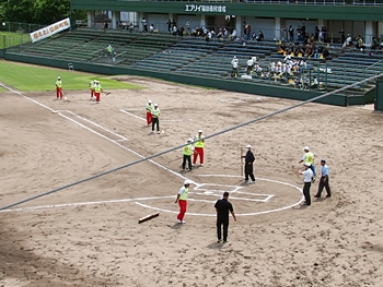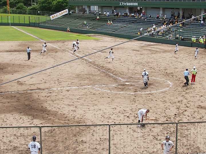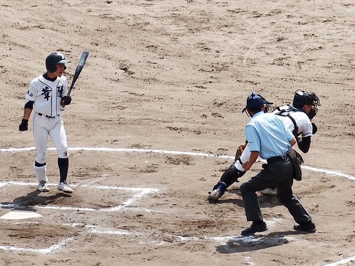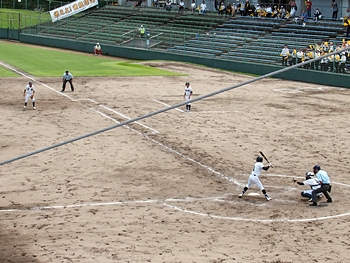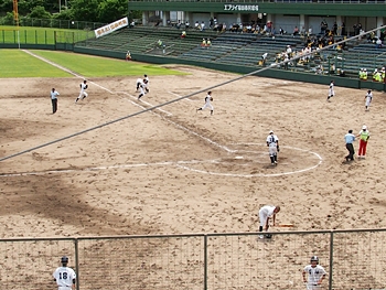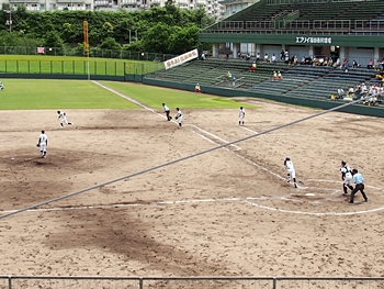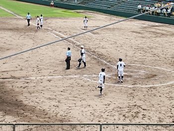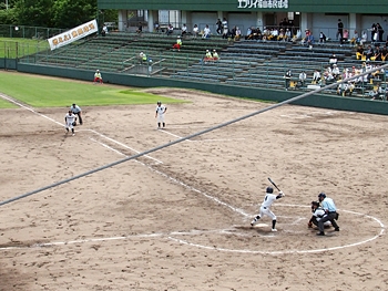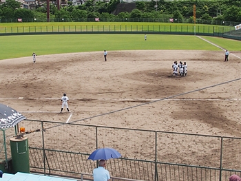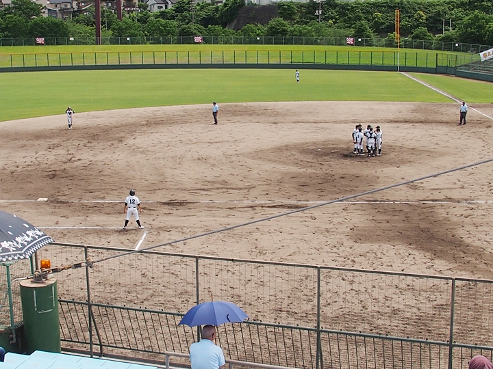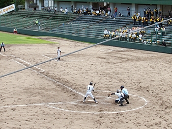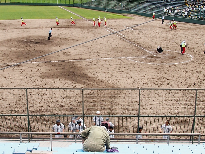 そして再開で、6回表の葦陽高の攻撃ですが、まず先頭打者が1塁に。この走者を2塁、そして3塁へと進め、2アウト1・3塁。追加点の好機到来ですけど、両チームともモタついておりますから、さて、どうなりますか…