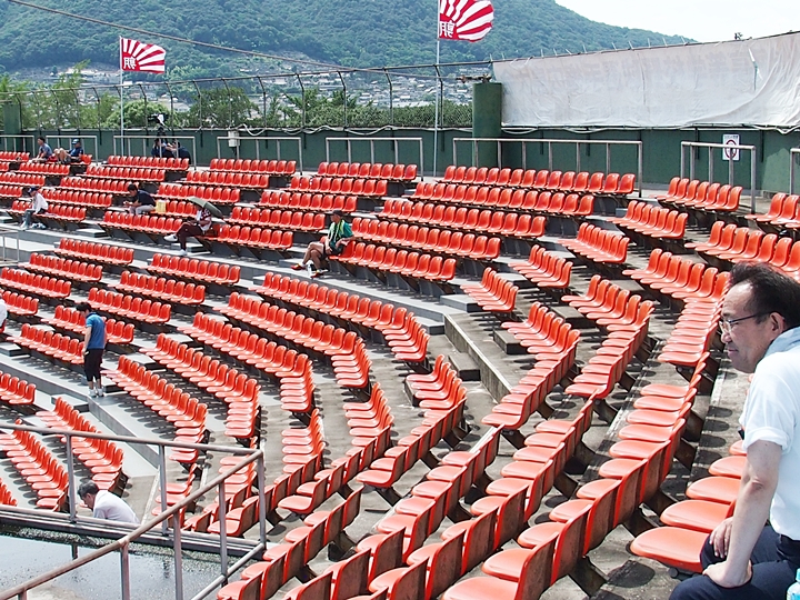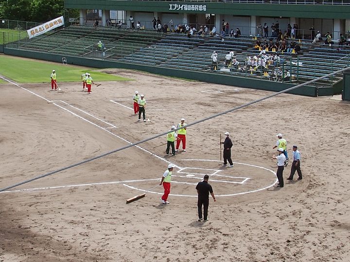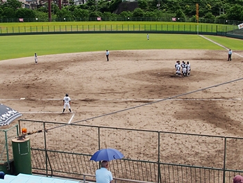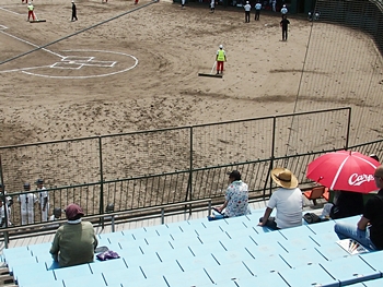5回の攻防が終わりますと、グランド整備・休息タイムです。さほど日差しは強くは無いのですけど、ジトッとした蒸し暑さ。GONsanも喫煙タイムとなりました。