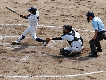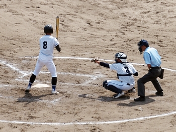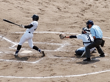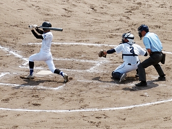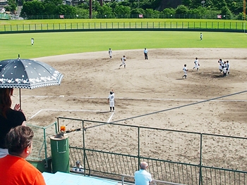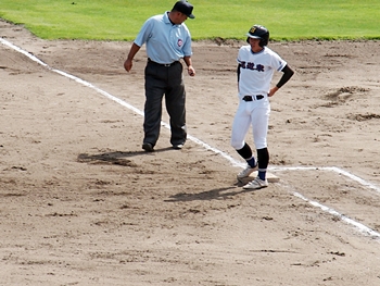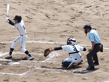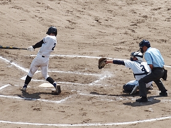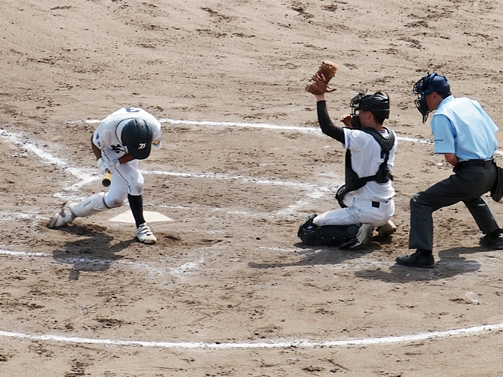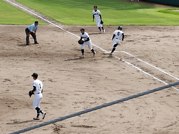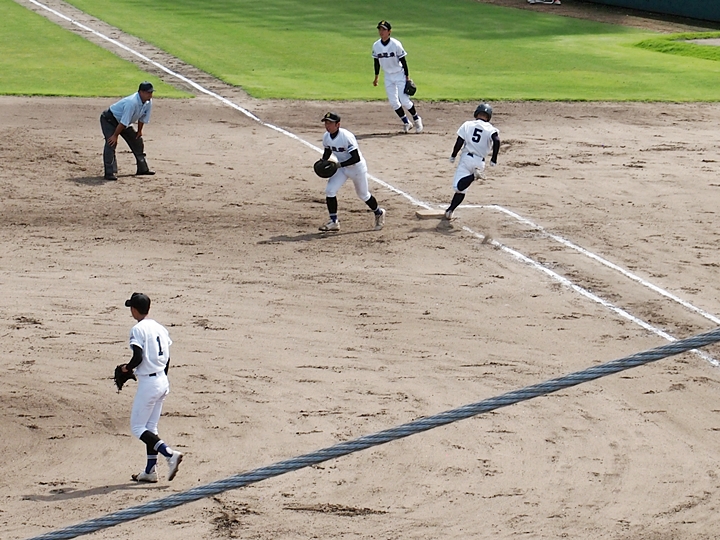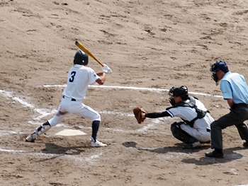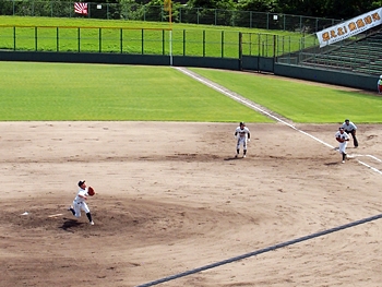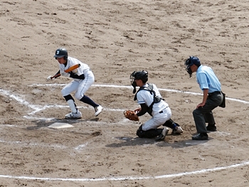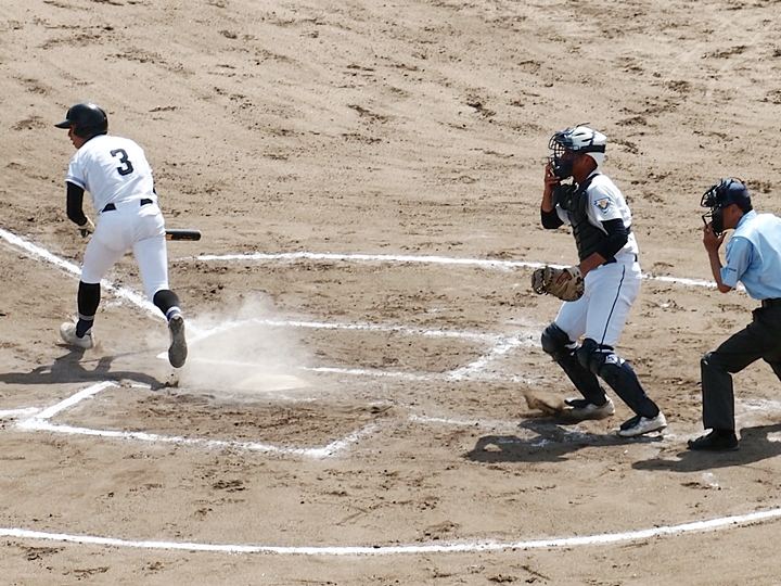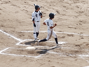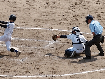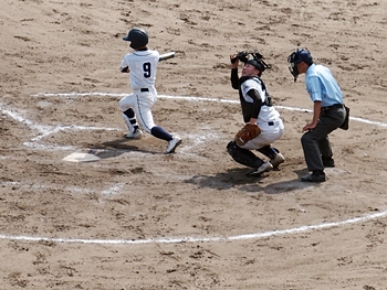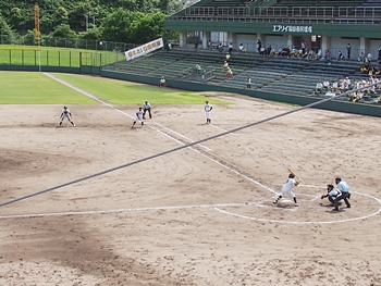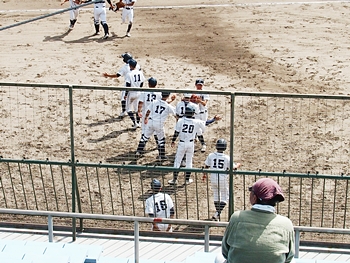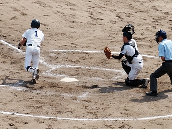 投手の投げました球を捕手が後逸。この間に、3塁走者は難なく本塁へ(^-^)「葦陽2×1尾道東」と、再び1点リードの葦陽高。