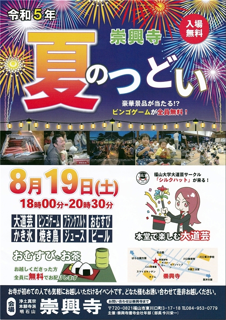 ふん、ふん、「崇興寺夏のつどい=vですか…新型コロナウイルスの感染症法上の位置付けが「5類」に移行しましてからは、福山市内でも色んな行事・イベントが再開で賑わっては来ましたネ。