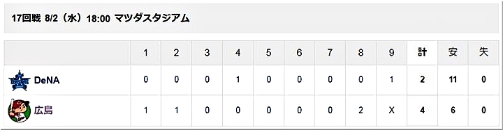 ◇セ・リーグ 広島4ー2DeNA (2023年8月2日 マツダ)