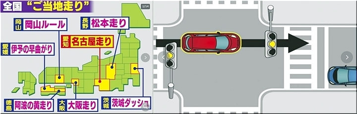 全国には、愛知県の「名古屋走り」、大阪府の「大阪走り」、茨城県の「茨城ダッシュ」、長野県の「松本走り」、岡山県の「岡山ルール」、愛媛県の「伊予の早曲がり」、徳島県の「阿波の黄走り」といった様々な呼び名の「ご当地走り」があります。