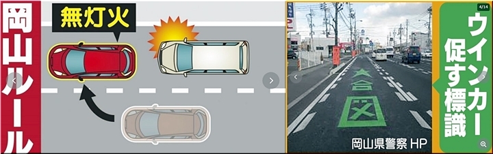 「岡山ルール」はウインカーを出さないで強引に割り込む車線変更です。このため、岡山県の道路には「ウインカーを促す」道路標示がある場所もあります。