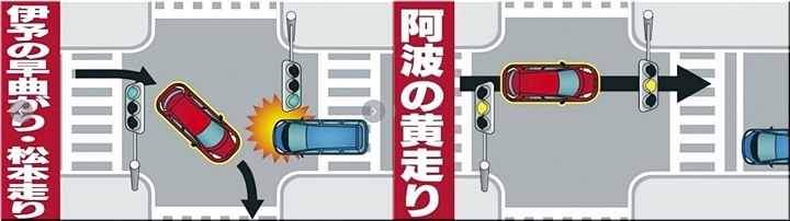 「伊予の早曲がり」と「松本走り」や「茨城ダッシュ」は、いずれも青信号で直進車よりも右折車が先に曲がる行為です。