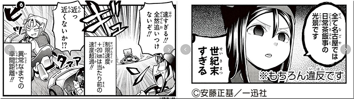 名古屋文化を題材にした、安藤正基さんの「八十亀ちゃんかんさつにっき」(一迅社)でも、「名古屋走り」を題材にしたマンガが描かれています。