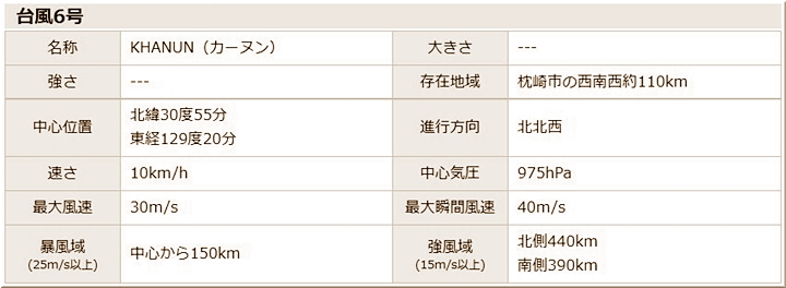 気象庁によりますと、大型で強い台風第6号は、5日午前8時ごろには久米島の北約160キロの北緯27度40分、東経126度40分にあって、1時間に10キロの速さで東北東に進んでいます。