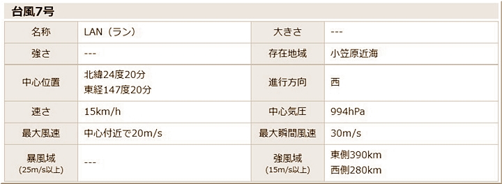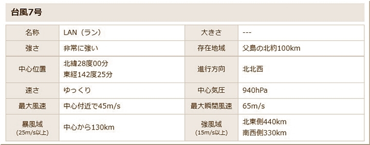 中心気圧は975ヘクトパスカル、最大風速は35メートル、最大瞬間風速は50メートルとなっています。