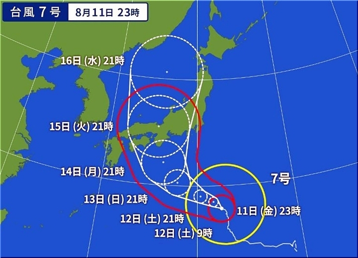 この台風は、15日(火)には近畿から東海にかなり接近し、上陸するおそれがあります。その後、台風は日本海を北上し、16日(水)から17日(木)頃にかけて北海道に近づくおそれがあります。