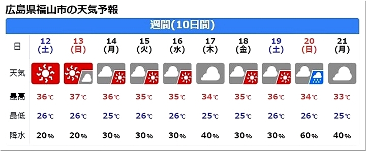 …との事ですけど、8/13〜8/15間の、福山市の週間天気予報を見てみますと、お盆の間は降雨は無さそうで、とりあえず一安心。