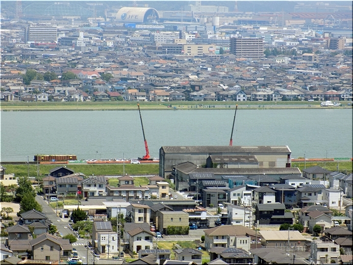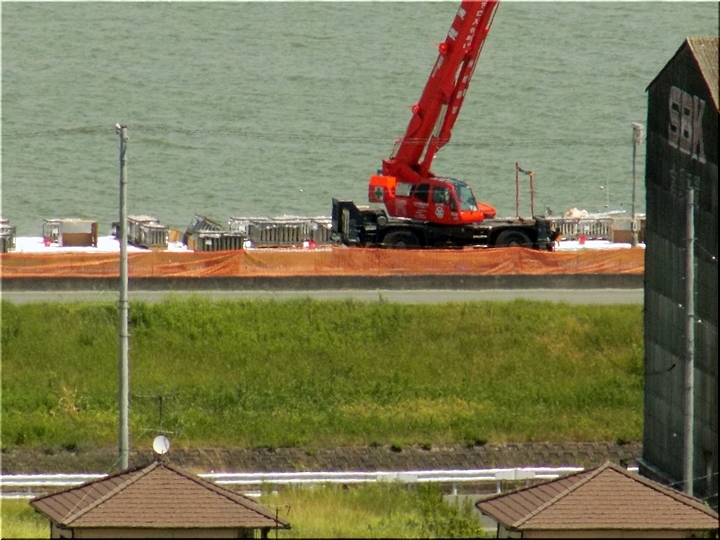 河川敷方向に眼を向けますと、8/15の花火大会の準備が進行中です。クレーンを使用し、台船に花火をセットしておられますのでしょうねぇ〜