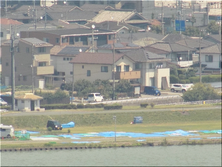 河川敷のブルーシートを撮りました画像は、昨日、墓地から西新涯側を撮りましたモノなんです。水呑側の河川敷のブルーシートは、夕方までに凡て撤去されておりました。