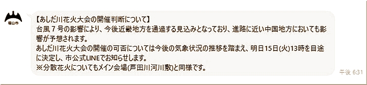 あしだ川花火大会の開催の可否については今後の気象状況の推移を踏まえ、明日15日(火)13時を目途に決定し、市公式LINEでお知らせします。