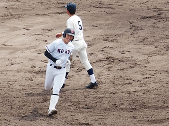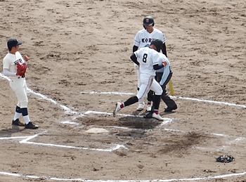 その裏の広陵高校、手堅く走者を進め2アウト3塁。この走者を本塁に帰し、また1点追加です。