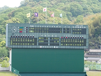 3回裏の広陵高校は、死球で出ました走者を手堅く進め追加点。3回を終え「広島商0×4広陵」と4点差。う〜ん、伝統のあります両校ですけど、何となく力の差を感じてしまいます。