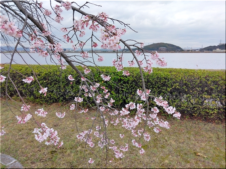 ウォーキングロードを市民球場方向に進んで行きますと、水飲み場とあずまやの間のしだれ桜(八重桜?)=cここも、ほぼ満開ですから、時たま、散策しておられます方が立ち止まり、スマホでパチリの光景も(^-^)